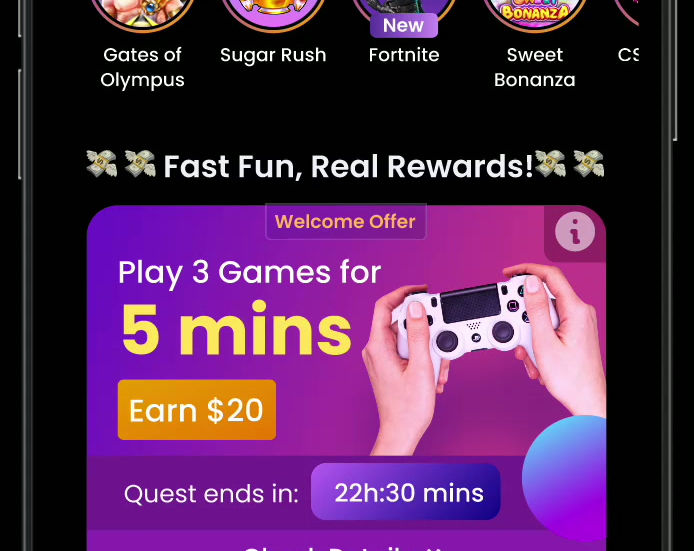 A mobile rewards app that motivates users to earn rewards through personalized games, challenges, races, and surveys, designed for fast decisions, low friction, and engaging play.